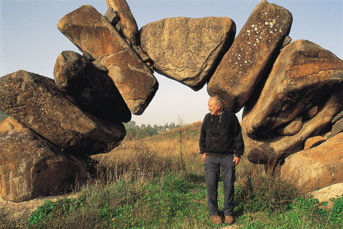 אנו עומדים ליד הקשת הגדולה, והוא מספר איך נעזר בדרוזי זקן מהגולן שהיה היחיד שהצליח להציב את האבנים הקטנות הנכונות שיחזיקו את אבן הקשת המרכזית. אפילו קטיושה שהתפוצצה בסמוך לא גרמה לתזוזה.