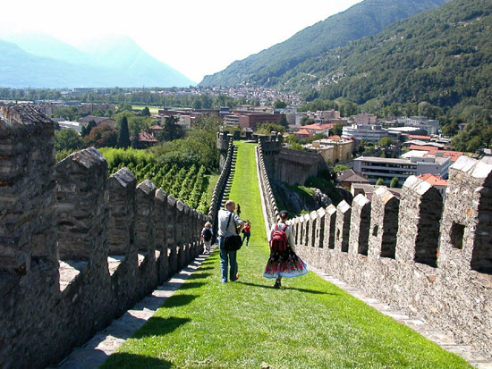 בכפרים רבים אפשר לשכור בית רוסטיקו ולבלות בטיולים ברגל בנופים פראיים. השקט מוחלט, האוויר קריר וצח עם ניחוח קלוש של אח מעשנת. יש בתים שקועים ממש בתוך הסלע, שמזכירים לפעמים ביתו של הוביט בפלך. מסלול טיול טיפוסי באזור מוביל מסונלרטו לפורוליו, ובפורוליו נמצאת מסעדת הגרוטו La Froda, עם הפולנטה הנחשבת לטובה ביותר באזור. הגרוטו הם מערות האחסון העתיקות של מצרכי המזון, שהפכו לטברנות הטיפוסיות של טיצ'ינו, והתפריט בלה פרודה סובב סביב פולנטה עם בראזאטו (בשר) או גבינת גורגונזולה ופיצוקרי – פסטה כוסמת. מידע נוסף על אפשרויות טיול, אתרים, אירועים, מלונות ועוד בלוקארנו, אסקונה והעמקים מסביב באתר של לשכת התיירות – www.ascona-locarno.com המבצרים של בלינצונה לוגאנו רבתי או לוקארנו ועמקיה – לא חשוב באיזו מהן בחרתם כבסיס, בלינצונה בירת טיצ'ינו היא תחנת חובה בטיול בקנטון. יש ארבע סיבות לבקר בה: שלושת המבצרים ושוק השבת שלה. המבצרים, שנבנו במאה ה-15, הם אתר מורשת עולמית של אונסק"ו ומהשמורים והיפים באירופה. מומלץ לעשות ברגל את הדרך המתפתלת ביניהם דרך לב העיירה בליווי אודיו גייד, שאפשר לשכור בלשכת התיירות המקומית. אם תבחרו לבקר באחד בלבד, כדאי בקסטלגרנדה, המבצר הגדול המתנשא מהרחוב המרכזי. יש בו מסעדת גרוטו טובה עם נוף נהדר, ותערוכות ואירועים. אם תגיעו לעיירה בשבת תרוויחו את אחד השווקים המקסימים של טיצ'ינו, עם שפע של דוכני אוכל מקומי, בגדים, תכשיטים ואווירה נעימה במיוחד.  קסטלגרנדה בבלינצונה, מהמבצרים היפים באירופה