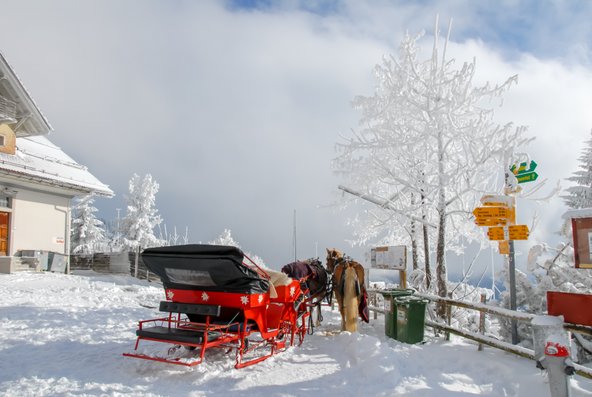 החורף התחיל השנה מאוחר יחסית, גם בשווייץ, ולכן פעילויות השלג שבדרך כלל מתקיימות בהר בשלב הזה של השנה, כמו הליכה בנעלי שלג או גלישה במזחלות, עדיין לא התקיימו. יחד עם זאת, היה לזה יתרון בולט – הנופים היו מגוונים במיוחד וכללו את מרחבי השלג של שווייץ החורפית עם הירוק של שווייץ הקיצית, והיו יפים במיוחד. בפסגה יש כמה מסלולי הליכה, חלקם מתאימים לחורף. אנחנו בחרנו במסלול שיורד לתחנת הרכבל הבאה, Rigi Staffel. אמנם לפי השלט מדובר בהליכה של עשרים דקות בלבד, אבל הצעידה במסלול המושלג והחלקלק בירידה עם ילדה בת ארבע וחצי נמשכה למעלה משעה, וכללה הרבה עצירות לבניית אנשי שלג ותצפיות נוף משגעות. מ-Rigi Staffel ירדנו עוד תחנה אחת ברכבל ל-Rigi Kaltbad, שם חיכו לנו שני סוסים רתומים לעגלה, שלקחו אותנו לטיול ביער. מושבי העגלה היו מרופדים בצמר כבשים, קיבלנו שמיכות מחממות ויצאנו לדרך, לטיול ביער מהאגדות, כשמסביב שלג ופלגי מים ושקט של חורף, כשרק הלמות פרסות הסוסים נשמעות.