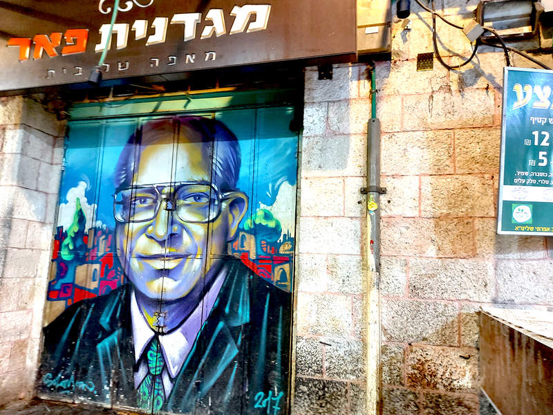 בערב, כשהתריסים מוגפים, מתגלים הציורים הצבעוניים שמתארים דמויות של פוליטיקאים, משוררים ובעלי דוכנים בשוק