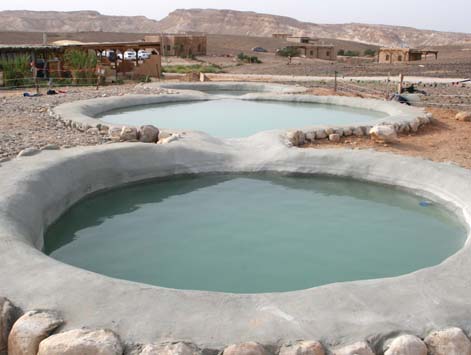 צימרים וקמפינג חוות האנטילופות: אפריקה זה כאן בחוות האנטילופות שעל כביש הערבה, ליד מושב צופר, האנטילופות מסתובבות חופשי לצד בעלי חיים נוספים כמו עזים, כבשים ואיילים. אתר הלינה נמצא במתחם החווה, הוא אמנם מגודר ומופרד משטח החיות אבל אפשר להשקיף ממנו על האנטילופות ולהרגיש כמו בספארי אפריקני. אזור הלינה מחולק לאתר קמפינג ולאתר צימרים. באתר הקמפינג יש סוכות ללינה, סגורות ומחוממות בחורף, עם מחצלות ומזרנים; תאורה; נקודות חשמל; מקלחות עם מים חמים ושירותים נקיים. יש גם פינות מנגל עם שולחנות פיקניק, אזור למדורות ומקום להקמת אוהלים פרטיים. מתחם הצימרים מתאים למי שרוצה להתפנק, ויש בו צימרים ממוזגים מעץ, שבהם חדר רחצה עם ג'קוזי ושירותים, טלוויזיה, מקרר, מיקרוגל ומרפסת עם ריהוט גן וערסלים מול הנוף. המתחם כולו משרה שקט ושלווה, ויש בו בריכת מי גופרית מקורה שמימיה מגיעים לטמפרטורה של 32 מעלות. מסביב לבריכה יש ערסלים, מזרנים וכריות לרביצה, מדשאות ושטחי משחק לילדים. איפה אוכלים? במושב צופר הסמוך אפשר לאכול, בתיאום מראש, במסעדת גן ירק האורגנית שמציעה ארוחות בוקר, צהריים וערב צמחוניות, טעימות ובריאות שמבוססות על הגידולים האורגניים של בעלי המקום. טלפון: 052-3666819. אפשרות נוספת היא חאן גמלייה שנמצא בק"מ ה-137 על כביש הערבה שמציע פיצות ופיתות בדואיות, חומוס, תבשילים ביתיים וחמין בשבת. טלפון: 052-3666240. אפשר גם להזמין ארוחות למקום (או לכל מקום שתבחרו במדבר) אצל דני שניטמן ממושב ספיר שמכין ארוחות בשרים ארגנטינאיות משובחות. טלפון: 052-3666174, 052-3666774. טלפון: 052-3666041 אתר אינטרנט ימי מדבר בצוקים: בקתות אקולוגיות במדבר מתחם האירוח ימי מדבר שביישוב החדש צוקים, ממערב לכביש הערבה, מציע אירוח אקולוגי יוצא דופן, ומהווה הרבה יותר מעוד מקום להניח בו את הראש בלילה אחרי יום של טיולים באזור. את המקום הקימו יאיר בלנסקי ורינת בשן שהגיעו לצוקים מהמרכז אחרי שחלמו להקים כפר נופש ירוק. במתחם יש תשע בקתות אירוח אקולוגיות שעשויות מבוץ ומקש ומשתלבות היטב בסביבה. הבקתות מתאימות למשפחות או לזוגות, ובכל אחת מהן יש פינת שינה, פינת ישיבה, פינת קפה או מטבחון, מקלחת עם מים חמים תמיד, שירותים אקולוגיים נוחים ונעימים, חצר פרטית עם ערסל, וקמין עצים או מעגל מדורה מצוידים בעצי בעירה. למרות שהסביבה מציעה הרבה מסלולי טיול, מאוד מפתה להישאר במקום וליהנות מהמרחבים מהשלווה המדברית. במיוחד קשה לצאת מהבריכה המוצלת, שמורכבת משלוש בריכות עגולות הזורמות האחת לשניה, ומעוצבות בהשראת גב מדברי טבעי. יש גם בריכת בוץ שתשמח מאוד את הילדים, שייהנו גם מפינת החי הקטנה שבמקום. במקום מתקיימות פעילויות רבות שימלאו בתוכן את החופשה, כמו סדנה של בניה ירוקה ופיסול בבוץ, סדנאות יצירה אקולוגיות, טיול מודרך למציאת שיני כריש מלפני 70 מיליון שנה וטיולי אופניים שיוצאים ממש מפתח הבקתות.  | | הבריכה בימי מדבר. מעוצבת בהשראת גב מדברי טבעי |