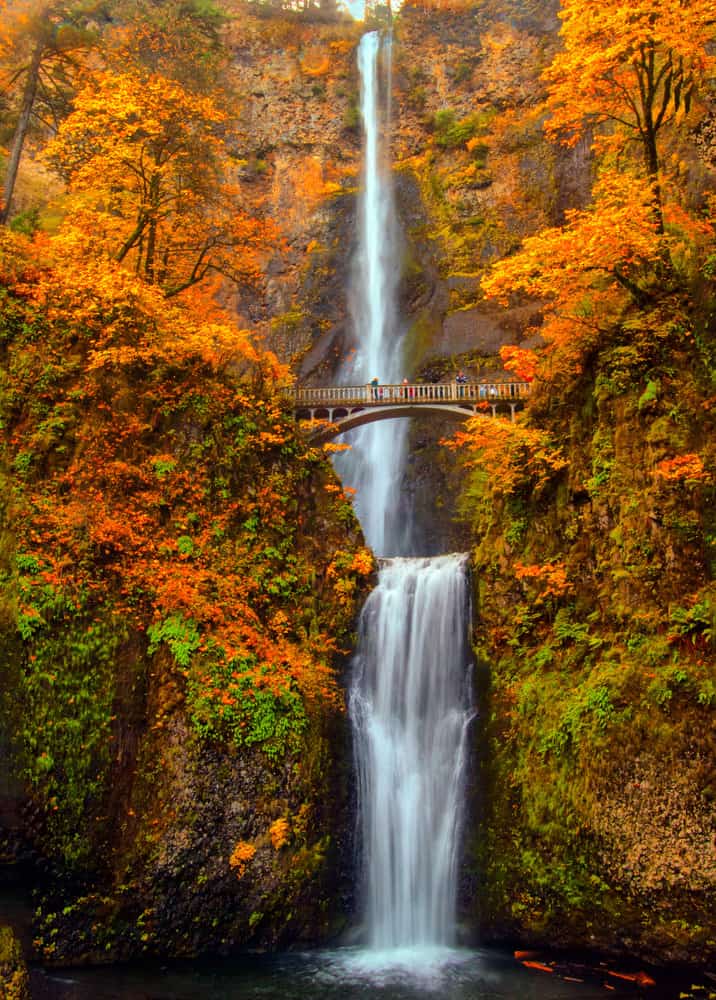 מדינת אורגון שבצפון-מערב ארצות הברית שופעת יערות ושופעת מים. השילוב הזה מביא לכמה מראות קסומים במיוחד, בעיקר באזור של ערוץ נהר קולומביה, רק חצי שעת נסיעה מפורטלנד הבירה. באזור יש מפלים רבים, והגבוהים מכולם הם מפלי מלטנומה (Multnomah Falls) שנופלים בשצף מכמה מדרגות מגובה 189 מ'.רבים באים לראות את המפלים בחורף, כשהם קופאים והופכים לנטיף קרח עצום, אבל בסתיו, כשהעצים מסביב משנים את צבעם לכתום, המראה מהפנט לא פחות.