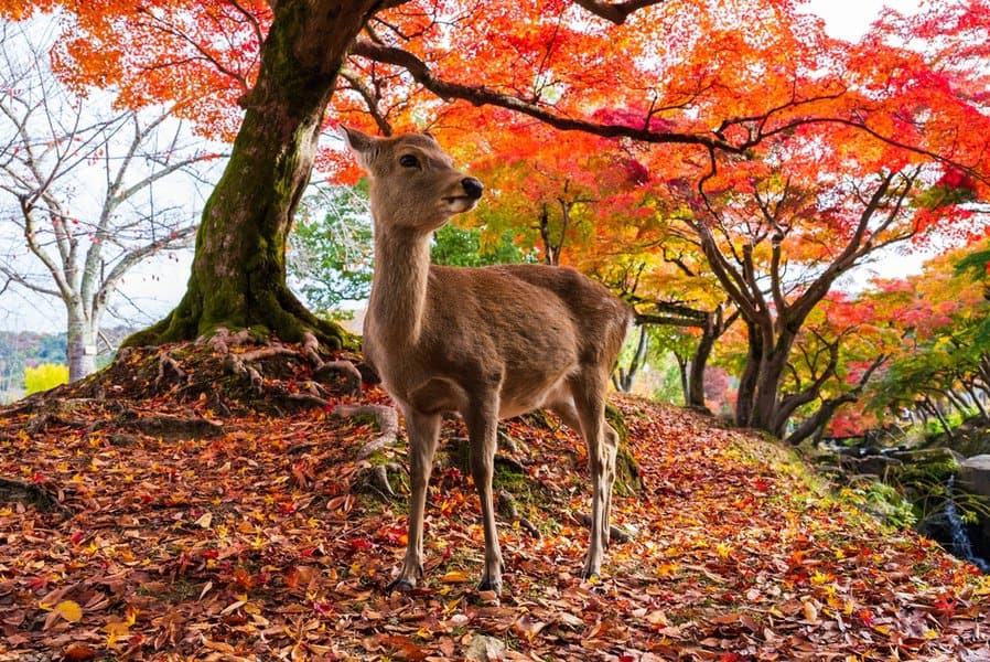 העיר נארה (Nara), הסמוכה לקיוטו, מפורסמת הודות למקדשים הרבים שלה – יש בה שמונה מקדשים בודהיסטיים אשר הוכרזו כאתרי מורשת עולמית של אונסק"ו – והודות לפארק שלה, בו מסתובבים כ-1,300 איילים אשר אינם חוששים מנוכחות בני אדם. הסתיו הוא עונה נהדרת ליהנות מאזור המקדשים והפארק של נארה כשהוא מכוסה בשלכת אדמדמה.
