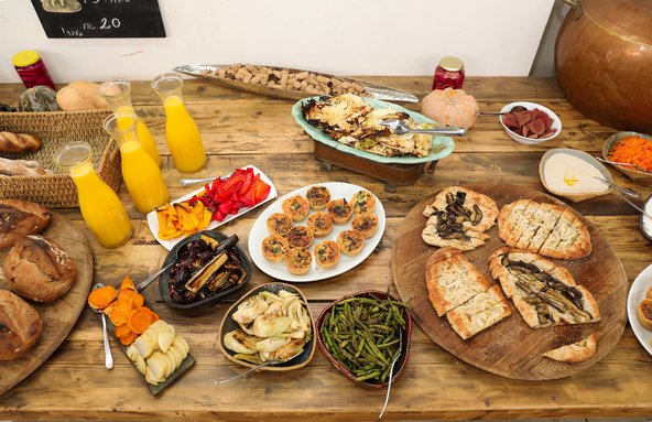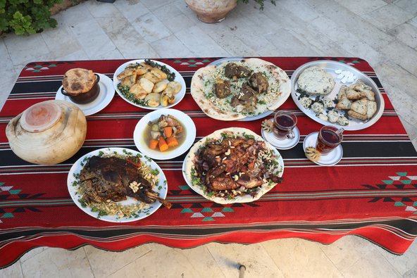 האירוח נדיב מאוד, המנות עצומות, ועבור 100 שקלים בלבד תקבלו 16-14 סוגי סלטים, 3 סוגי מאפים – קראסים שמנמנים הממולאים בתרד, זעתר ובשר, ממולאים, ובהם עלי גפן, קישואים, לשון הבר ועוד, וכל זה עוד לפני המנות העיקריות. אלו כוללות מאכלים מסורתיים כמו מנסף (אורז מאודה על לאפה עם בשר כבש, צנוברים ושקדים), סינייה, מקלובה (אורז מבושל עם ירקות מטוגנים ובשר כבש או עוף), מפתול (קוסקוס ערבי המגולגל בידיים ומוגש עם בצל מתובל, עוף או כבש) ועוד ועוד. לקינוח מקבלים מעמול תמרים וקפה. ואם תרצו תוספת מכל מנה שהיא תקבלו אותה ללא תוספת לחשבון אך עם חיוך רחב. במסגרת הפסטיבל יגישו מקום קראסים במילוי גבינת כבשים ותרד ושישברק – כיסונים במילוי גרגרי חומוס ותערובת עלים המבושלים במרק לבן, גבינתי וחמצמץ. הבית של סלווה עין נקובה טלפון: 073-7585681  שולחן גדוש במטעמים במסעדת הבית של סלווה