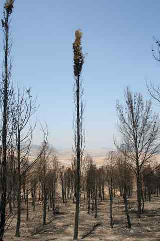 מדוכא בסבך, עד לשריפה הבאה הנותנת לו הזדמנות להגביר את תנובתו ולפלוש לבתי גידול חדשים שהתפנו. מכת חום סביר על זרעיו דווקא מגבירה אצלו את הנביטה. השפעת האש על תהליך התפתחותן של חברות צומח היא סוגיה בפני עצמה. לדברי האקולוג ד"ר רון פרומקין, בתהליך ההשתקמות הופכת תצורת צומח נמוכה (בתה) לשיחים ועצים נמוכים (גריגה), ואלה הופכים לחורש שהוא חברת השיא. "יש רבים הטוענים ששריפה היא חלק מהמערכת של האזור הים-תיכוני", הוא אומר. לשיטתם, סופו של החורש להישרף ולשוב להיות בתה. זה לא עניין פילוסופי בלבד, טענתם היא שהחורש הים-תיכוני מותאם אבולוציונית לאש. ניתן לראות זאת אצל האלונים בגולן, שלהם גזע עם שכבת הגנה עבה שאש מהירה של דגנים לא נתפסת עליו. יש גם מינים עמידים לאש, שמתחילים לצמוח מצוואר השורש אחרי השריפה. מעניינים במיוחד יחסי הגומלין של האורן עם האש. האורן פותח את אצטרובליו ומשחרר המוני זרעים בעת שריפה. ככל שאוכלוסיית אורנים חשופה לשריפות בתדירות גבוהה יותר, כך גדל שיעור התופעה. הסיכוי לנביטת אורן בצל עץ בוגר נמוך, וכך גם סיכוייו להצליח בתחרות עם נבטים אחרים ועם העץ עצמו על האור ועל המאגר ההולך ומידלדל של המינרלים בקרקע. עיתוי מתאים מאוד לנביטה הוא מיד לאחר שריפה: השטח פנוי, אין תחרות על האור ובקרקע יש ריכוז מינרלים גבוה שמקורו בצמחים שנשרפו. "ניתן אולי להסתכל על אורן ירושלים כעל צמח המוביל את המערכת האקולוגית שבה הוא חי לקראת שריפה", מציע פרופ' אוריאל ספריאל במאמר על אודות ההיבטים האקולוגיים של השריפה בכרמל. במהלך גדילתו, מגדיל העץ את מאגר הזרעים שעל גופו, ובד בבד מגדיל גם את דליקותו שלו. כאשר מגיע הזמן שבו יש על העץ הרבה מאוד זרעים, הוא גם דליק מאוד. זה הזמן בו שריפת העץ תיתן יתרון רב לצאצאיו, גם אם אותו עצמו תכלה האש. רפלקס מותנה משכובתה האש נשאלת השאלה מה עושים? הפוליטיקאים, כדרכם, אצים רצים לטעת נטיעות סמליות שלא בעונתן (להזכירנו כי לא המעשה חשוב בעולמם, אלא סיפור המעשה, ובעיקר תמונתו). מתברר כי נטיעה אינה בהכרח המעשה הנכון. "יש גישות שאומרות 'לא לעשות כלום', יש כאלה שאומרים שלא טוב אפילו לעקור את הגזעים השרופים", מסביר ד"ר פרומקין. לדעתו, יש להותיר 10-5 עצים שרופים לדונם, כדי לאפשר שיקום באמצעות ציפורים המפיצות זרעי צמחים. "העצים חשובים גם לעופות דורסים דוגמת בזים וינשופים כעמדות טרף ומנוחה". בנוסף, אם מפנים  | | עצי אורן שרופים ביער ביריה. לאורן יחסי גומלין מעניינים עם האש | צילום: גילי סופר |