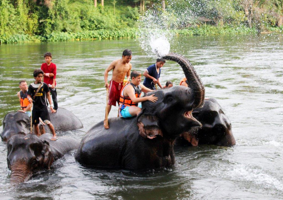 כאן מתחילה החגיגה: סיור קצר בג'ונגל ובנהר רכובים על גבי הפיל, ומי שרוצה לשבת על הראש של הפיל ממש כמו מהוט מקצועי חשוב שיגיע עם מכנסים (לא סתם אומרים "שערות של פיל" – הן ארוכות, קשות ודוקרות). גולת הכותרת של המפגש היא רחצה אישית עם הפילים בנהר – חוויה מדהימה של פעם בחיים, במפגש בלתי אמצעי עם היונק היבשתי הגדול ביותר בטבע.