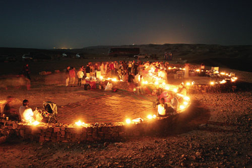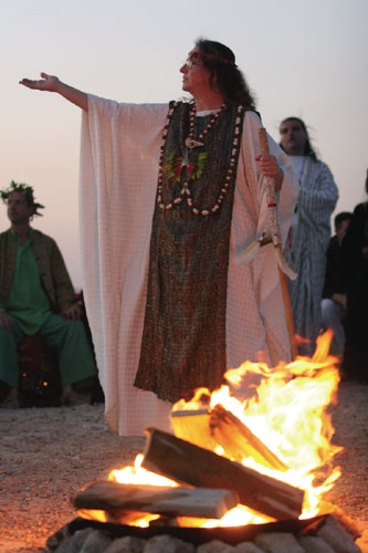 השמאן" חייבים להשתתף בכל הטקסים. "מי שלא בא לטקס או לא מכין את מה שהוא צריך, עף", מבהירה לב־נאור. "בשביל להיות שמאן, אדם צריך לדעת שלושה דברים: לדבר, לרפא ולעשות טקסים. פעמים רבות רואים בשמאניזם משהו רוחני, אבל זה דבר פיזי מאוד: הכלים שבהם אנחנו משתמשים למעבר בין העולם האנרגטי לעולם שלנו הם כלים פיזיים. המסגרת של 'דרך השמאן' היא מסגרת מאתגרת וקשה מאוד, והמסלול שיש לעבור יכול לקחת שנים", היא מבהירה. ההפקה הלוגיסטית של כל טקס שכזה היא גדולה ומורכבת ומצריכה תכנון וביצוע קפדניים. חברי "דרך השמאן" מכינים את עצמם על ידי עבודה קבוצתית ואישית הכוללת תרגול ומה שלב־נאור מגדירה "יציאה למסעות פנימיים ופגישה עם בעלי הברית כדי לקבל הנחיות ולהחליט איך לבצע את התפקיד". הדרמה הכרחית ותופסת מקום נכבד. "אם אני רוצה לתת לך זר פרחים ולהגיד לך שאני אוהבת אותך, אני יכולה פשוט להגיש לך אותו, אבל אם אני אלבש בגד מיוחד ואצבע את הפנים שלי ואביא חבורה של נגנים, זה ייראה אחרת", מסבירה לב־נאור. "המסר מועבר בדרך שתקל את הקבלה שלו, כמו שבתיאטרון יש מוזיקה ותפקידים ותלבושות ודמויות ותפאורה. לאט לאט למדנו לעשות את כל הדברים האלה". לב־נאור נשאבה לפילוסופיה ולדרך החיים השמאנית לפני יותר מעשרים שנה. התהליך כלל מסעות לשמורות אינדיאניות בארצות הברית ובמקסיקו, למידה וחניכה רשמית. היא ודב הקימו את בית הספר במיתר, ומאז הם עסוקים בהכשרה ובריפוי בשיטות אינדיאניות, באימון, בתקשור ובלמידה בלתי פוסקים. ואכן, כל שמונת חברי "דרך השמאן" יודעים לשיר ולתופף ("לתוף אנחנו קוראים 'הסוס של השמאן'. הוא מהדהד עם התדרים של האדמה, ועליו אנחנו רוכבים למסעות לעולמות האחרים"), ומבצעים את תפקידיהם, המשתנים מטקס לטקס, באופן מופתי. האווירה רחוקה מלהיות "כבדה" או מפחידה, והקהל, המורכב מחברי הקהילה שאינם חברים ב"דרך השמאן" ומסתם סקרנים, מוזמן להשתתף ולצפות. הכניסה בחינם, רק לא לשכוח להביא אוכל לסעודה הצמחונית שנועלת כל טקס. נישואין לתשע שנים חודש מאוחר יותר אנחנו נפגשים שוב, והפעם כדי לחגוג את "טקס איחוד הלבבות" — טקס הנישואין השמאני. נגה, שמאנית לעתיד ומרפאה בטכניקת ריפוי אינדיאנית הקרויה "קורי־אור", תאחד הלילה את לבה עם זה של שי, בן זוגה. טקס נישואין שמאני, אגב, תקף לתשע שנים בלבד, אבל ההכנה, המכשולים והנדרים חמורים ומחייבים לא פחות מאלה של הרבנות. הפעם אנחנו נמצאים ממערב למצדה, בלב המדבר. שמש בצבע תפוז שוקעת בין ההרים, ירח מלא כבר עלה, וההתרגשות רבה. החתן והכלה  | | האורחים יושבים במעגלים, זה טוב לאנרגיות |