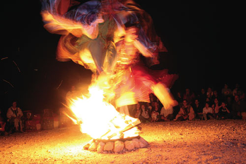 נכנסים בתלבושות צבעוניות ויושבים בכיסאות הכבוד שלהם. האש נדלקת, והאנרגיות נקראות להיכנס למעגל. לב־נאור פותחת את הטקס: "כאשר זוג מחליט לאחד את הלבבות שלו, כל הקהילה משתנה. לכן אנחנו צריכים להכין את הקהילה וגם זה את זה. לצורך העניין שלחנו שני אנשים לברר מי הם נגה ושי". "היום, בנוכחות כולכם", קוראת לב־נאור בתיאטרליות, "נדע בדיוק מי הם". היא מזמינה את אפרת, החברה הטובה של הכלה, להציג בפני שי, קבל עם ועדה, את חמש התכונות הנוראיות ביותר של נגה. במקצועיות שלא היתה מביישת תובע בבית משפט ובהנאה גלויה סובבת אפרת בקהל, וכולם לומדים שנגה היא סנובית שלא מסוגלת לסבול שיש אנשים טובים ממנה, שהיא אוהבת להשפיל את הזולת, ושכשהיא במצב רוח רע היא אחד האנשים הכי פחות נחמדים על פני אמא אדמה. "היא חסרת חמלה, ומי שהיא מחליטה להיכנס בו, מוטב לו שיארוז את הדברים ויעבור לגלגול הבא!" מכריזה אפרת לקול צחוק הקהל וקריאות "הו!" אינדיאניות, שפירושן "כאן ועכשיו!". ולסיכום: הו! לאחר ששי נשאל אם הוא בטוח באמת ובתמים שנגה היא מה שהוא רוצה, ומשיב בחיוב, מהדהדות קריאות "הו!" מכל עבר, והקהל נחשף לחמש התכונות היפות של הכלה, מכשפה חכמה, רבת עוצמה ואנרגיות, שמביאה מאגרי יופי לעולם, צוחקת הרבה והופכת את החיים למגוונים ומלאי הפתעות. התהליך חוזר על עצמו כשנגה מתבקשת להתייצב מול תכונותיו הרעות של שי. לאחר שהיא עונה ב"כן" החלטי, לב־נאור פוקדת להוסיף עצים למדורה,  | | לפני הנדרים, החתן והכלה קופצים מעל למדורה כשהם עטופים שמיכה מיוחדת. חתונה שמאנית תקפה לתשע שנים |