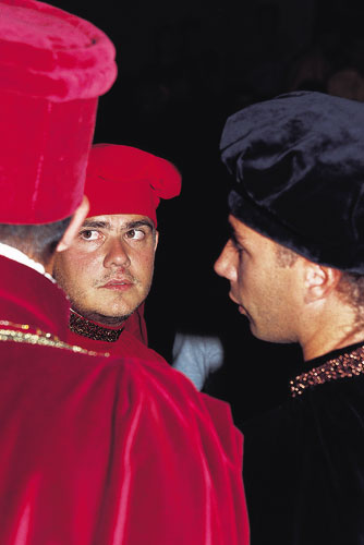 כי דמותו של ישו, הקבועה על הצלב, גולפה זמן רב לפני שיצרו את הצלב עצמו ונקבעה על צלב קדום יותר. תיאוריה זו מאפשרת אולי ליישב את פערי הזמנים הקיימים בין המסורת העממית לבין ממצאי המחקר. במהלך הטקס הדתי יצא הפסלון המפויח ממאות טקסי אש, ובצידו פסעו האנשים המחופשים. "למן קדמת ימי הביניים היו התהלוכות הדתיות משמשות סיבה להתחפשות במסכות, בין שהיו ילדים בלבוש מלאכים מלווים את 'לחם הקודש' או את תמונות הקדושים ועצמותיהם הנישאות", כתב יעקב בורקהארדט בספרו "תרבות הרנסאנס באיטליה". "אולם לחגי הכנסייה הגדולים נתלווה כבר מזמן קדום עניין התהלוכה העירונית, שמעורבים היו בה סממנים חילוניים מרובים והטעם התמים של ימי הביניים לא היה נפגם מכך". עמדתי בסמוך לביתו של המלחין המפורסם ג'קומו פוצ'יני, יליד לוקה, שכתב אופרות מפורסמות, ובהן "לה בוהם" ו"טוסקה", ויצירות דתיות יפות לא פחות. מן הסמטה הבטתי בכנסיית סן מישל אין פורו המצעד האנושי עבר בסך למרגלות הכנסייה: נשים בבגדי פשתן וזהב, תלבושות ארגמניות שאפיינו את בני האצולה בעבר, כובעים שמזכירים את אלה שצייר פיירו דלה פרנצ'סקו ושלל תחפושות של לוחמים, נזירים, אצילים ועובדי אדמה, שהחזירו את לוקה כולה, ולו לשעות אחדות, לימי פארה וגדולתה. |