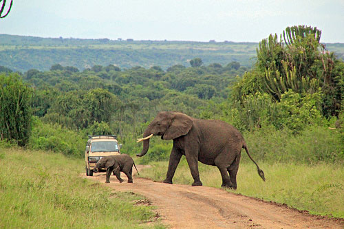 הפארק הלאומי קווין אליזבת (Queen Elizabeth Narional park). זוהי השמורה המתוירת ביותר באוגנדה, ולא קשה להבין למה. בשטח השמורה יש גיוון נופי גדול, מסוואנות רחבות ידיים דרך אזורי גבעות ומכתשים געשיים ועד אגמים תכולים יפהפיים. להשלמת התמונה, רכס רוונזורי (Rwenzori Mountains), שלמרגלותיו נמצאת השמורה, משמש כתפאורת רקע מרשימה. בספארי בשמורה אפשר לפגוש פילים, אריות (שאפשר לראותם מנמנמים על ענפי העצים), תאואים, בבונים, אנטילופות ועוד.