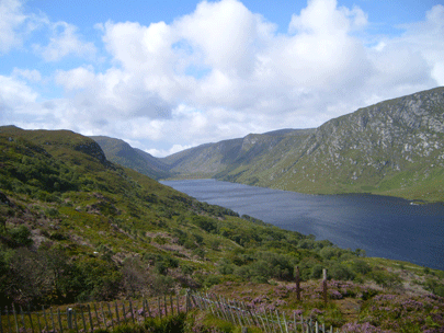 פארק Glenveagh. פני השטח הרריים, פה ושם פזורים אגמים קטנים, ויש גם אגם אחד גדול שמוקף בגבעות יפות