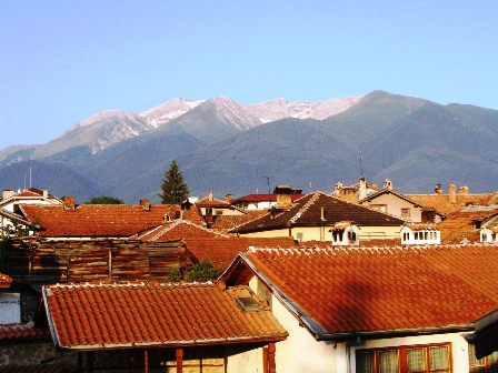 גגות אדומים ברובע העתיק של בנסקו. מעל מזדקרות פסגות ההרים