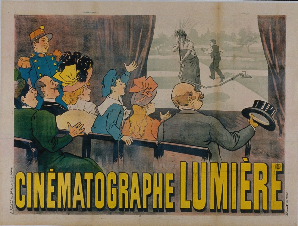 (+) הקליקו להגדלה כרזת פרסומת לסינמטוגרף של האחים לומייר. האחים לומייר היו ממציאי הראינוע. לא רק שהם המציאו את הטכנולוגיה הבסיסית (מצלמה, סרט צילום ומקרן) המשמשת בצילום הקולנועי, הם גם היו הבמאים הראשונים של סרטי ראינוע. בנוסף, המציאו האחים לומייר את הסינמטוגרף – מצלמה ששימשה גם כמכשיר הקרנה ופיתוח לסרטים. בדצמבר 1995 הם שכרו את אולם "גראנד קפה" בפריז והחלו להקרין את סרטיהם באופן מסחרי. הסרטים שהקרינו, באורך של דקה, הלהיבו את ההמונים, ובעקבותיהם הוזמנו האחים לומייר לסיבוב הופעות בבומביי, לונדון וניו יורק.