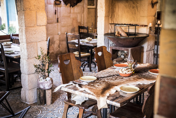 המסעדה עצמה נמצאת במבנה אבן עתיק והאלמנטים העיצוביים בה עשויים מעץ טבעי, כולל התקרה וכיסאות העץ הגדולים. במרפסת רחבת הידיים, שבמרכזה עץ זית עתיק יומין, נמצאת המעשנת וכך יכולנו לספוג את האווירה ולצפות בנתחי הבשר שעושנו במעשנת בזמן שחיכינו לאוכל. גימיק נחמד הוא קערה של בוטנים טבעיים שמקבלים מיד עם ההגעה – הסועדים מוזמנים להשליך את הקליפות לרצפה, דבר שעל פי המסורת מביא מזל ליוצאים לצייד.