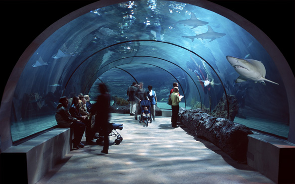 המנהרה האקרילית השקופה שמוקפת בבריכה מכל עבריה. המבקרים מתבוננים בכרישים ששוחים ממש מעליהם