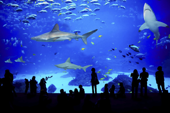המנהרה האקרילית השקופה שמוקפת בבריכה מכל עבריה. המבקרים מתבוננים בכרישים ששוחים ממש מעליהם