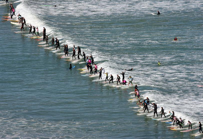 למפת דרום אפריקה באירוע ייחודי שהתקיים השבוע (17 בספטמבר) בחוף Muizenberg שבקייפטאון, דרום אפריקה, הצליחו 73 גולשי גלים, בגילאי 7-67, לגלוש יחד על אותו גל במשך 5 שניות. מארגני האירוע טוענים שבכך נשבר שיא גינס העולמי לכמות האנשים הגולשים בו זמנית על אותו גל. השיא הקודם, שהושג באירלנד, עמד על 44 גולשים. עם זאת, עדיין לא התקבל אישור רשמי על שבירת השיא מספר השיאים של גינס. למעלה מ-1,000 צופים באו לחזות באירוע, שלא היה רק בגדר חיפוש אתגרים חדשים. מדובר למעשה באירוע התרמה, שמטרתו היתה לגייס כסף עבור תוכנית ייחודית שנועדה להגן על הרוחצים בשני חופים פופולריים הסמוכים לקייפטאון מפני כרישים לבנים, הנפוצים באזור. במסגרת התוכנית, משקיפים המצוידים במשקפות, בדגלים ואפילו בסירנות, יזהירו את הרוחצים מפני הכרישים. הכרישים הלבנים הגדולים הם מין מוגן בדרום אפריקה, אך הם אחראים לפגיעות רבות ברוחצים, בהן גם קטלניות. רק בחודש שעבר נקטעה רגלו של מציל דרום אפריקאי, לאחר שננשך על ידי כריש במהלך אימונים שביצע בחוף בסמוך לקייפטאון. |