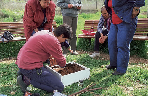 נראות בשעות אחר הצהרים קבוצות קטנות של הורים וילדים. וכך, בין עצי הזית לצמחי השומר והשעורה, כל משפחה רכונה על הערוגה שלה: עודרים, גוזמים, שותלים. תמורת תשלום חודשי סמלי הם מקבלים מהמינהל השכונתי שתילים, מים, כלי עבודה והדרכה. במקום מתקיימים חוגי טבע וגינון לילדים ולמבוגרים: בערוגה של אופיר ורוני מגדלים ציפורני חתול; נועה, גלית, רני ואשד מעדיפים אזוב וכרוב, ויש ילדים המגדלים באמבטיות ישנות כלניות ואפונה ריחנית, ממש כמו בגינות מימים עברו.