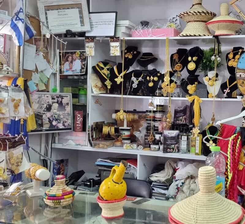בין הפריטים בחנות האריתראית: אופנה מסורתית שרווחים כאן ברחוב, כלי בישול וקנקני חרס לטקס הכנת ה"בונה", תכשיטים וציורים של אמנים אריתראים ועוד. צילום יעל עופר