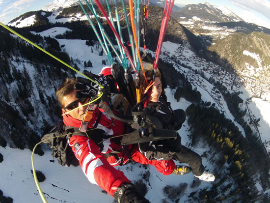למרגלותינו נפרשת שמיכת השלג הרכה העוטפת את האזור כולו מאופק לאופק במלוא הדרה. מבין קרעיה מבצבצים יערות האשוח שמן הגובה הזה עציהם נראים כמו נרות יום הולדת על עוגת קצפת ענקית. מן המרחקים נבטת אלינו פסגת המון בלאן, הגבוה שבהרי האלפים. מפעם לפעם אנו נוסקים על גבי תרמיקה אדירה בסחרור פראי, חגים במחול מכושף עם הרוח בין רכסי הרים מושלגים הבוהקים בשמש החורפית ומדרונות מיוערים המשתפלים בתלילות אל העמק הנפרש במרחק של כ-2,000 מטרים למרגלותינו. רוח נעימה מלטפת את הפנים החשופות, מערסלת אותנו בתוך הוד הקדומים שמסביב, פטריק מחייך בגאווה של מי שמציג לראווה את אוצרותיו, ואני נזכרת בחלומות של ילדות רחוקה, כשאני הייתי וונדי ופיטר פן היה מגיח מן החלון ונושא אותי עמו למסע רחיפה בשמיים לעבר עולמות רחוקים. בקתות העץ הציוריות של לה קלוזה נראות כעת כבתי בובות זעירים, ואנו גולשים מעליהן על זרמי אוויר חם, וממשיכים ונישאים הלאה על פני גל בלתי נראה מעל פסגות מושלגות, שחלקן מתקמרות ברכות ואחרות, פראיות ומשוננות יותר, כמו קוראות תיגר על השמים, וביניהן מצוקים תלולים סחופי רוח הטובלים באחו בשלל גוונים של ירוק. מרחפים בתוך גלויה. רגעים ארוכים דאינו כך בין שמיים וארץ, כמו נוצה ברוח, חופשיים מכבלי כוח הכבידה. לבד מאוושה שקטה של הרוח במיתרים כל רחש אינו נשמע. בתוך החופש המוחלט וכל היופי הזה, אפילו לי נגמרות המילים.