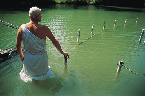 אתר ירדנית, ישראל. המים מטהרים את הגוף מאבק ומזיעת היום ואת הנפש מלכלוך חטאינו. האם באמת יש למים כח מטהר, או שרק האמונה בכך מעניקה להם את הכוח המיוחד? | צילום: אלדד לופט