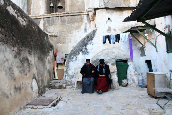 בתקופה הצלבנית שימש גג הכנסייה כאולם סעודות של אבירים, אבל תקרת האולם לא שרדה ורק שרידי העמודים והקשתות מעידים על הפאר שהיה פה פעם. ב-1760 הכנסייה האתיופית לקחה לידיה את החורבה, אך מאחר שהמקום היה שייך לפני כן לכנסייה הקופטית, ניטש מאז ועד היום סכסוך בעלות על השטח. המנזר שב לידי קופטים ב-1830, ואילו האתיופים שבו והשתלטו עליו לאחר מלחמת ששת הימים. כיום מתגוררים במקום נזירים אתיופיים המנהלים חיי שיתוף סגפניים. .jpg) נזירים אתיופים על גג כנסיית הקבר. עד היום ניטש מאבק בעלות על המקום | צילום: יעקב שקולניק