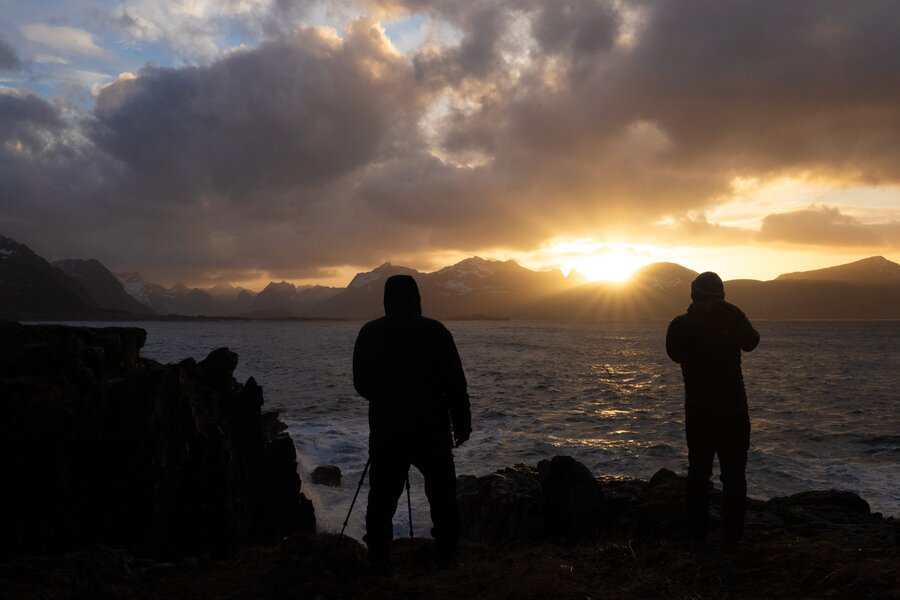 אחרי ארבעה ימים בנורווגיה, שברובם השמיים היו מכוסים בעננים, לפתע הפציעה השמש לקראת שקיעה וצבעה את העולם בכתום. עצרנו בצד הדרך, ירדנו לחוף השחור, והסתכלנו מהופנטים אל הים הדרמטי והצוקים המזדקרים ממנו, בעודם נשטפים באורות חמים. טיפסתי על תלולית קטנה והתיישבתי עם הפנים מערבה. לרגעים ארוכים הרגשתי את הטבע חודר אליי, והבנתי למה מלכתחילה יצאנו למסע הזה.