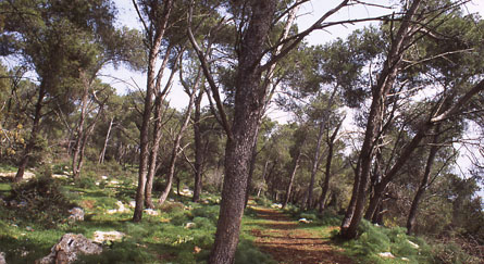 ממגרש החניה שבראש ההר נשוב כברת דרך קצרה במורד הכביש בו באנו. נחלוף תחת השער המסוגנן שנבנה בתקופה הצלבנית ונפנה שמאלה בשביל שסימונו שחור. בצלע הדרומית והמזרחית של ההר חולף המסלול בעיקר דרך יער אורנים נטוע, אולם בפינה הצפון-מזרחית של ההר ניתקל בכמה ידידים ותיקים – אלון תבור ואלה ארצישראלית, שגזעיהם העבים מעידים על גילם.