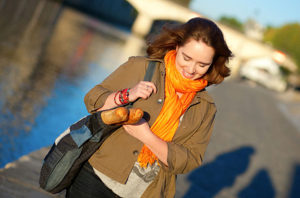 בגטים זהובים מציצים מתוך תיק של פריזאית צעירה