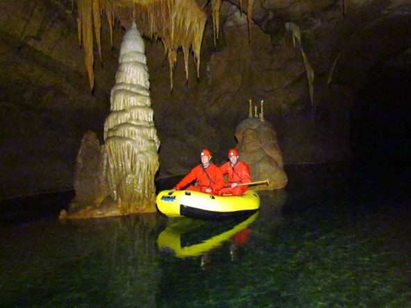 בכניסה למערה לבשנו את הציוד המיוחד שקיבלנו, שכלל חרמונית מחממת, קסדה, פנס ראש ומשוטים לחתירה בסירת הגומי שחיכתה לנו במערה עצמה. כרבע שעות ארך השיט על מי הטורקיז הצלולים שבמערה. שטנו על פני נטיפים וזקיפים בעלי צורות ייחודיות – פה ראינו אוניית מלחמה, שם אוזני פיל או מבצר נסתר, כמיטב הדמיון הפרוע.