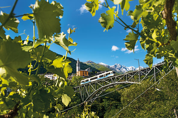 צ'ינטוואלי, איטליה ושוויץהשם של קו הרכבת הזה – Centovalli, מאה העמקים, מעיד על הנופים המצפים לנוסעים בין דומודוסולה (Domodossola) שבחבל פיימונטה בצפון איטליה ללוקרנו שבקנטון טיצ'ינו בדרום שווייץ. אורך המסלול רק 52 ק"מ (מתוכם 32 ק"מ באיטליה ו-20 ק"מ בשווייץ), אבל הנסיעה כאן איטית ונינוחה, עם לא פחות מ-21 תחנות בדרך. האזור ההררי מספק עליות וירידות רבות, וכמה גשרים דרמטיים במיוחד. מחלונות הרכבת נשקפים נופים מקסימים, הכוללים עמקים ירוקים, שתוכם חבויים כפרים קטנים עם בתי אבן עתיקים, כרמים, יערות ומפלים. משך הנסיעה: שעה וחמישים דקות מידע מעשי והזמנת כרטיסים  רכבת הצ'ינטוואלי המחברת את צפון איטליה עם דרום שוויץ | צילום: swiss-image.ch/Marcus Gyger