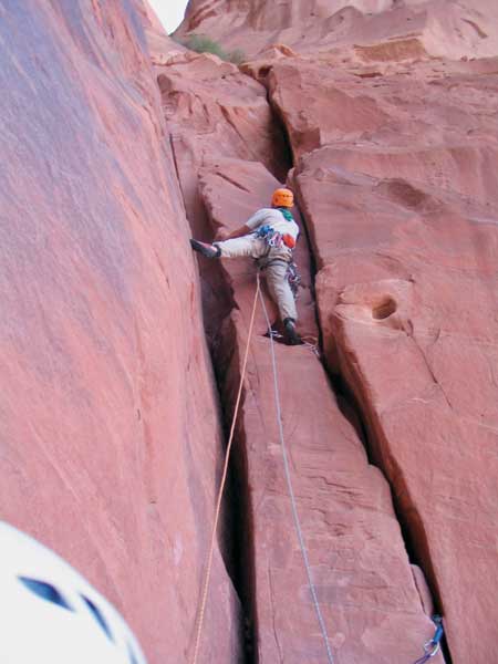 אני מתחברת לחבל שמור עיגן אל התחנה העליונה, ואלון מאבטח אותי מלמטה. מתקרבת לסלע, שולחת רגל ויד שמאל לחפש אחיזות, אבל לא מוצאת משהו יציב מספיק. אולי מזווית אחרת? אני מחליקה את כף היד בחיפוש אחר מדף קטן או סדק שאליו אוכל להכניס את האצבעות. דקות ארוכות עוברות עד שאני מצליחה לטפס על הסלע הגדול הראשון, שמוליך למעבר צר.