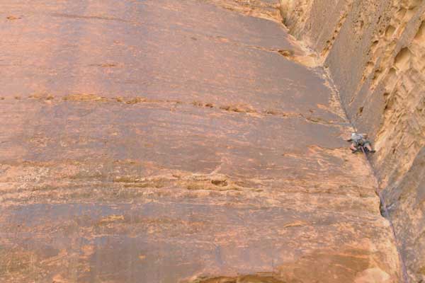 אל המסלול הזה, אחד מכ־350 מסלולי טיפוס שחורצים את הוואדי, הגעתי עם אלון גורן ועם מור דורון, שני דוקטורנטים, שלפחות אחד מהם שקול בדרך כלל. ההתחלה היתה לחוצה. אנחנו מגיעים אל הגבול עם ירדן ומתעכבים מול הפקידה בבנק. עוד עשר דקות מעבר הגבול נסגר, ואז נבלה את הלילה בצד הישראלי שלו. כל ההכנות וההזדרזות יהיו לחינם. הפקידה מתעקשת למתוח את המחוגים ולקחת את הזמן, וגם את הכסף, לצד רצף של שאלות לא רלוונטיות. הסיכויים להיכנס לעקבה בשעה כזו הולכים ופוחתים, אבל לבסוף היא משחררת אותי עם דינרים ביד, ואני רצה להסביר בהתנצלות לירדנים במחסום שעוד שני ישראלים מגיעים אחרי.