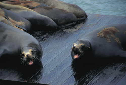 מה הקשר בין ההיסטוריה של קליפורניה לבין היונקים הימיים החיים לאורך חופיה? מתברר כי אירועים שונים בתולדות המדינה התרחשו בגלל הימצאות בעלי החיים האלה כאן, וכיווני התפתחות צפויים השתנו כאשר אותם בעלי חיים נטבחו ונעלמו. במאה ה־18 היו שתי תנועות חדירה של אירופאים לאיזור: מצפון הגיעו ציידי פרוות רוסים בחיפוש אחר פרוות של יונקים ימיים, שהיו שרועים באלפיהם, בלא חשדנות, לאורך החופים. מדרום הגיעו הספרדים, מגלי האיזור. מחשש לאובדן השליטה במרחב, הם החלו לבנות לאורך החופים מאחזים בדמות תחנות מיסיון, מרכזים דתיים, צבאיים וחקלאיים (ראו כתבה בעמ' 112). לכאורה, צפוי היה שתתפתח בקליפורניה אוכלוסיה דו לשונית – דוברי שפתם של טולסטוי ופושקין בצפון, ודוברי שפת סרוונטס ולורקה בדרום, אבל תאוות הבצע של ציידי הפרוות לא ידעה שובע. הם טבחו ביונקים הימיים, עד שכמעט הביאו להכחדתם. כשהתמעט השלל, חזרו צפונה על עקבותיהם ושבו לאמא רוסיה. ההמשך ידוע: מהגרים הגיעו ממזרח, בדרכי היבשה והים, וקליפורניה הפכה למדינה דו לשונית, שבה מספר דוברי האנגלית שווה למספר דוברי הספרדית. אוכלוסיות יונקי הים הקליפורניים לא שבו לקדמותן מאז, אך אמנות בינלאומיות מגינות עליהן, והן הולכות וגדלות באיטיות. הפרווה הצפופה בעולם לוטרת הים (Enhydra lutris), מסדרת טורפי היבשה, היא חיה חביבה, המוכרת בתנוחת הציפה שלה – על הגב. לעיתים היא מניחה אבן על בטנה כסדן, ומרסקת עליה צדפות שהיא שולה מהקרקעית. פרוותה היא הצפופה ביותר בעולם החי – כ־160 אלף שערות בסנטימטר רבוע – ולכן היה לה ביקוש עצום, שהביא אותה לסף הכחדה. ממאות אלפים שרד גרעין קטן, שהיה בסיס לשיקום המין. היום הלוטרה הימית מוגנת ומצליחה להתרבות באיטיות. אריות הים (ממשפחת Otaridae) וכלבי הים (ממשפחת Phocidae) – שתי המשפחות השייכות לסדרת הטורפים הימיים Pinnipedia – דומים במראם החיצוני. אבל אריות הים  | אריות ים קליפורניים בסן פרנסיסקו. תיירים רבים מגיעים כל השנה כדי לצפות באריות הים השרועים על משטחי העץ במזח 39 צילום: דביר בר-גל |