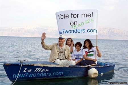 | ברנרד וובר בן ה-57 מבקר בישראל במסגרת קמפיין לבחירת שבעת פלאי הטבע בעולם. ים המלח הוא אחד המועמדים המובילים. הראיון איתו נערך בעין גדי. בצהרי אותו יום הגיע מאילת עם ספי הנגבי מנכ"ל מנהלת תיירות הים האדום. בעין גדי חיכו לו יוסי לשם, נציג החברה להגנת הטבע הישראלית, מנצור אבו ראשד, הנציג הירדני שהגיע לאירוע ועימאד אטרש העומד בראש המקבילה הפלשתינית של החברה להגנת הטבע. וובר עצמו הקדיש את רוב תשומת ליבו לבימוי הצילום של הסירה. כל פרט חשוב בעיניו. בנאום קצר הביע תמיכה במועמדות של ים המלח, המשותפת לישראל, לירדן ולפלשתין ובמועמדות של ים סוף המשותפת לישראל, מצרים, ירדן, סעודיה, סודן, עומאן, איחוד האמירויות ותימן. הוא קרא לעולם להציל את ים המלח שעלול להיעלם ופנה לצלם את הילדים בסירה. אחר כך הצטלם לצידם, כמי שרגיל מאוד לעמוד מול מצלמות. בשנת 1999 הגה וובר את רעיון בחירתם של שבעת פלאי תבל החדשים. מה שהתחיל כיוזמה פרטית קטנה צבר בזכות יכולתו לייצר רגעים מושכי תשומת לב תקשורתית להצלחה אדירה. את רגע המפנה הוא רואה ברעיון מבריק שעלה במוחו שבוע לפני המשחקים האולימפיים בסידני בשנת 2000. "יש לי מטוס ימי ישן שקניתי פעם כגרוטאה מחיל האוויר המרוקאי." הוא מסביר. "נחתתי איתו בנמל של סידני, מול בית האופרה המפורסם, שהיה אחד המועמדים לרשימת שבעת פלאי תבל. זו היתה תמונה מצוינת והיא שודרה ברשתות הטלוויזיה הגדולות בכל העולם. כולם כבר הכירו אותנו אחרי הקטע הזה והארגון צבר פופולריות. מאה מיליון בני אדם הצביעו בקמפיין הקודם במהלכו נבחרו שבעת פלאי תבל מעשה ידי אדם. האתרים שנבחרו – החומה הסינית, הטאג' מהאל, פטרה בירדן, הקולוסיאום ברומא, צ'יצ'ן איצה במקסיקו, מצ'ו פיצ'ו בפרו ופסל ישו בריו דה ז'נירו – הוכרזו בטקס ענק שהתקיים בליסבון ביולי 2007 ושודר ברחבי העולם. וובר מצביע על האירוע הזה כעל הדרך הכלכלית בה נוקט הארגון, שאינו חברה מסחרית ואינו פועל למטרות רווח. "אנחנו מממנים את הפעילות שלנו ממכירת זכיונות לרשתות טלוויזיה. כך עשינו בליסבון וכך נעשה גם בעתיד. ההכנסות האלה מכסות את הפעילות שלנו ומממנות גם את קמפיין החדש, לבחירת שבעת פלאי הטבע" (www.new7wonders.com). הציפיות מן הקמפיין הנוכחי עצומות: וובר מסביר שלהערכתו יצביעו באינטרנט ובהודעות טלפוניות מיליארד אנשים עבור האתרים השונים. "ברק אובמה נבחר כנשיא ארצות הברית בזכות 62 מיליון מצביעים, עבורנו הצביעו בקמפיין הראשון יותר ממאה מיליון. רק אירועים בסדר גודל של המשחקים האולימפיים או אליפות העולם בכדורגל מושכים יותר תשומת לב תקשורתית" הוא אומר בגאווה לא מוסתרת. על כסף הוא לא רוצה לדבר כיוון שלדעתו זה לא נושא מעניין כל כך. "אתה זקוק לכסף כדי לעשות את הדברים שאתה רוצה ואוהב." הוא בן למשפחה עשירה, אבל אומר שזה לא חשוב. את הסיפור על הפעם הראשונה בה הרוויח כסף הוא דווקא מספר בהתלהבות: "הייתי אז נער בן 16 ולאמא שלי היתה גלריה לאמנות. במהלך הקיץ הגלריה היתה סגורה וביקשתי ממנה להפעיל בה חנות. היא שאלה מה אני רוצה למכור. זה היה בסוף שנות השישים והסברתי לה שכולם רוצים לקנות עכשיו פוסטרים. במשך שלושה חודשי קיץ הרווחתי הון ממכירת הפוסטרים בגלריה, אבל גם הבנתי שחייב להיות בחיים משהו מעניין יותר מאיסוף כסף." את ההצלחה של בחירת שבת פלאי תבל הוא זוקף בעיקר לזכות ההתפתחות הטכנולוגית. "האינטרנט מאפשר לנהל קמפיין עולמי שמאות מיליונים משתתפים בו. זו הדרך הדמוקרטית ביותר לבחור, להצביע ולהשפיע." לדבריו זו גם הדרך הטובה ביותר להתעלות מעל הגבולות המדיניים. לאלה אין כיום חשיבות רבה טוען וובר ואין להם גם השפעה על הבחירה באתרים. הדוגמא החביבה עליו הוא הקולוסיאום ברומא שנבחר למרות שרק איטלקים מעטים השתתפו בתהליך. האתר שהוא פחות מחבב ברשימת שבעת פלאי תבל הוא פסל ישו בריו דה ז'נירו. "רציתי מאוד שייבחרו פסלי הענק באי הפסחא" מודה וובר. זה אתר מרתק והיה לו בעיני קסם גדול דווקא כיוון שאינו ניצב בלב מדינה עם מיליוני תושב