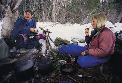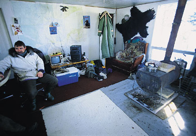 לויד סיפר לי שסב סבו נטש את סירת הדיג עליה עבד והקים בקתת עץ קטנה על גדות הגראנד לייק. לויד ואביו מתפרנסים מתפיסת חיות במלכודת וממכירת פרוותיהן. בחורף נהגו במזחלת כלבים לאורך הקו בו הניחו את המלכודות. סיבוב בין כל המלכודות נמשך יומיים או שלושה, ואחרי כמה ימי מנוחה היו יוצאים לסיבוב נוסף. ברברה, חברתו לחיים של לויד, הגיעה ללברדור מסיאטל לפני כ-15 שנים ונשארה. היא עבדה עשר שנים כאחות ברוב הישובים האסקימואים והאינדיאנים שבצפון לברדור, וחצתה בקאנו את כל הנהרות במקום. לויד וברברה אמורים היו לצאת איתי למסע שלשמו באתי עד כאן: 1,200 קילומטרים באופנועי שלג לאורך החוף, כדי לאתר את עדר נהר ג'ורג': 450,000 איילי קאריבו, המגיעים מדי אביב לחופי לברדור ועושים את דרכם צפונה, לפני הנדידה חזרה לפנים הארץ. בחורף על גדת האגם הקפוא האינדיאנים היו התושבים הראשונים של לברדור. הם הגיעו לשם לפני כ-3,500 שנה. בחורף חיו באוהלים, על גדות האגמים הקפואים. הגברים צדו את עדרי הקאריבו והנשים והילדים עסקו בדיג. באביב יצאו למסע רגלי ארוך ומייגע לכיוון החוף, וחיו במשך הקיץ, צדים כלבי ים ודגים. האינדיאנים לא ידעו הרבה נחת מאז הופעת האסיקומאים, שדחקו אותם מן החוף אל פנים הארץ. במהלך המאבק על השליטה באיזור בין אנגליה לצרפת שיתפו האינדיאנים פעולה עם הצרפתים, ויחד איתם נחלו כישלון חרוץ. במסגרת הפרויקט ההידרואלקטרי הענק של "מפלי צ'רצ'יל" הוצפו שטחי המחייה שלהם. משדה התעופה של גוס ביי יוצאים היום טייסים אנגלים, הולנדים וגרמנים להתאמן בטיסות נמוכות מעל מה שנותר מאיזור מחייתם. יש אמנם ניסיון של האינדיאנים להתנגד לכך באופן פעיל, אבל המאבק חסר סיכוי.