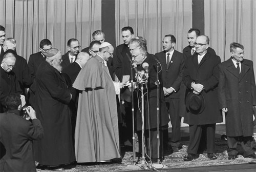 מגידו, 1964: פאולוס השישי, האפיפיור הראשון שביקר בישראל, נפגש עם נשיא המדינה, זלמן שזר, ועם ראש ממשלת ישראל, לוי אשכול. במהלך ביקורו הגיע האפיפיור גם לירושלים ולנצרת, אך מאחר שהבירה היתה מחולקת ומאחר שחשיבותה הדתית של נצרת נוצרית בעיקרה, נקבעה הפגישה ההיסטורית במגידו, אתר שחשיבותו רבה הן לנוצרים והן ליהודים | צילום : פריץ כהן, לשכת העיתונות הממשלתית