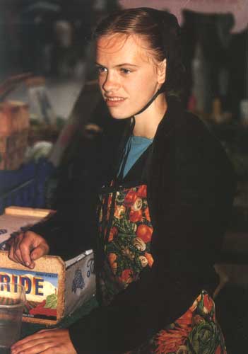 לו היתה הכתבה הזו סרט קולנוע, היא היתה נפתחת כך: חוץ. יום. שוק. המצלמה נעה באיטיות לאורך שורה של סלי נצרים עמוסים תפוחים אדומים, דלעות כתומות ענקיות, שקים של תפוחי אדמה, צנצנות ריבה, חריצי גבינה וכיכרות לחם תוצרת בית. אור רך של סתיו מלטף את דוכן העץ, הנראה כמו פרט בתמונה של אחד הציירים הפלמיים מהמאה ה־17. המצלמה מתמקדת במוכרת התפוחים, נערה צעירה בשמלה ארוכה וכהה, רכוסה עד צווארה. למותניה חגור סינר בד מגוהץ. צמותיה הארוכות משתלשלות מכיפת התחרה הלבנה הקשורה בסרט תחת סנטרה. עיניה מושפלות בצניעות לאדמה. המצלמה מתרחקת, מגלה עוד ועוד דוכנים. סביב הדוכנים טורחות בעמלנות נשים בשמלות ארוכות וכיפות קשורות תחת הסנטר, ולצידן גברים במגבעות קש, פורקים סלים מעגלות העץ. מאחוריהם מסתמנת שורת עגלות, כולן רתומות לסוסים. המצלמה מתרחקת עוד. לתמונה נכנסת ביואיק אדומה וחונה לצד העגלות. שוב מתרחקת המצלמה. מגרש החנייה ממלא את כל רוחב המסך: מצד ימין חונות בצפיפות מכוניות אמריקאיות ויפאניות. מצד שמאל חונה שורת עגלות עם סוסים. תנועה ערה מתנהלת בין הדוכנים למכוניות: קונים בג'ינס וסניקרס מעמיסים שקיות עמוסות כל טוב לתאי מטען ומפנים מקום חנייה, שנתפס מיד. ברקע כביש מהיר, ומאחוריו משתרעים אל האופק שדות תירס צהובים ויערות מייפל בצבעי שלכת. קאט. מידע נוסף: