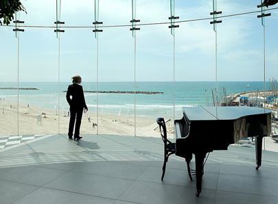 פסנתר כנף ונוף מרהיב של חוף הים בלובי של הרודס תל אביב