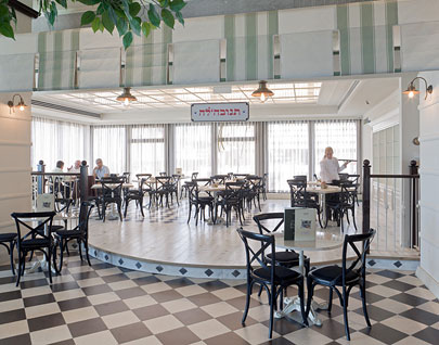 הנוסטלגיה לתל אביב של פעם ניכרת בכל פינה: השוער הלבוש מדים תקופתיים, שדרת הפיקוסים שמובילה את העין מדלת הכניסה אל הים שנשקף מהחלונות הענקיים, הגזוז בטעמים שמוגש בבר, מסעדת תנובה'לה עם המפות המשובצות, תמונות בשחור-לבן שמראות סצנות מתל אביב בשנות השלושים והארבעים, אריחי הרצפה המעוטרים. גם הפרטים הקטנים ביותר, כמו שלטי הכוונה מנוקדים ותאורה תקופתית – הכל מכניס את האורח לאווירה מיוחדת במינה.