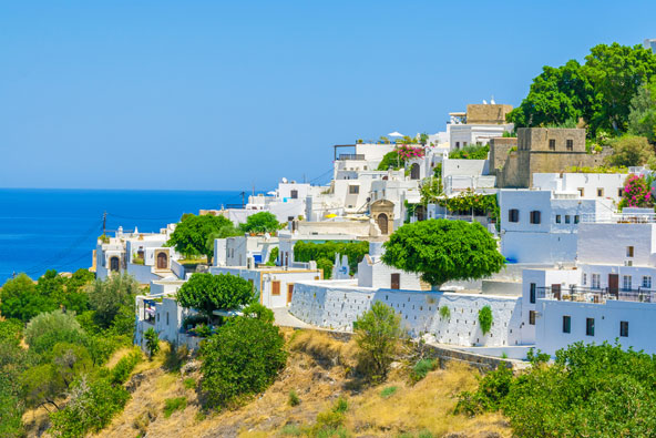 בתיה המסוידים לבן של העיירה לינדוס משקיפים אל הים התיכון בחוף המזרחי של רודוס | צילום: שאטרסטוק