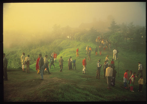 אחרי שעלתה השמש קרה דבר מפתיע. האנשים האלה, שבאו מרחבי הודו, וביניהם גם מעט תיירים מערביים, פנו לפתע והתפזרו. הם עשו דרך ארוכה כדי לצפות ברגע שהשמש בוקעת מעל ההימלאיה. הם כמעט לא ישנו בלילה הקודם, מכיוון שההתייצבות בתחנת היציאה בדרג'ילינג (DARJEELING), שבמערב בנגל, נקבעה לשלוש וחצי לפנות בוקר; הם היטלטלו בג'יפים בדרך קשה ותלולה, ואחר כך עמדו על קצה ההר הקרוי דווקא גבעה
