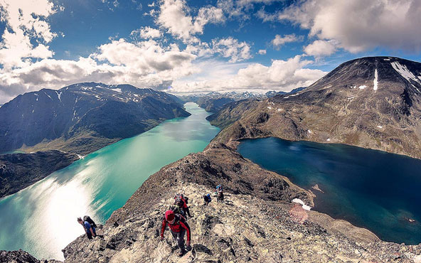 נורווגיה: מסלול בסגן בפארק הלאומי יוטונהיימן נורווגיה היא גן עדן לאוהבי הליכה, עם אינספור מסלולי הליכה מסומנים בכל הרמות, שבהם תמיד אפשר לראות את המקומיים עסוקים בספורט הלאומי – הליכה. כמה מהמסלולים הטובים ביותר נמצאים בשמורת יוטונהיימן שבמרכז המדינה, בה נמצאות הפסגות הגבוהות ביותר בנורווגיה, המתנשאות לגובה 2,500 מטר ויותר. בין לבין יש קרחונים, מפלים ואגמים קטנים. אחד ממסלולי היום החביבים ביותר על הנורווגים נמצא כאן – זהו מסלול בסגן (Besseggen), מסלול יפהפה שלאורכו נשקפים הרים נישאים ואגמים קרחוניים בכחול וירוק. ההליכה במסלול, שאורכו 22.9 ק"מ, מאתגרת למדי ונמשכת כ-8-6 שעות, כולל כמה עליות תלולות עד לנקודה הגבוהה ביותר במסלול – בגובה 1,743 מטר. ההליכה במסלול בסגן בנורווגיה כוללת עליות לא פשוטות, אבל תראו איזה נופים נשקפים מכל עבר | צילום: Sascha Kilmer
