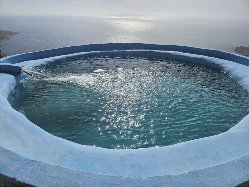 ובכן, מאיפה אביא מים לשטח ולגן? יש לי מאגר מים עגול, יפהפה ועתיק מאבן שעומד על צוק מעל לשטח. את המאגר שיפצתי וצבעתי בכחול, כדי שישתלב עם השמיים והים שבאופק. המאגר יכול להכיל כ-25,000 ליטר. אבל מהיכן אמלא אותו?