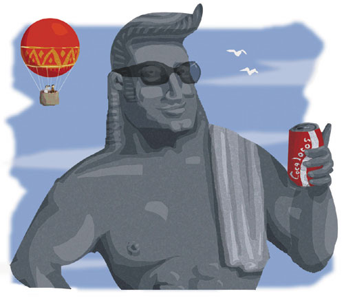 רוני ניסירוס מוכר בכל יום יותר ממאה מוצרים שהקולוסוס של רודוס מופיע עליהם. בזמן ששתינו קפה בחנות המזכרות שלו, באחד הרחובות הראשיים של העיר, סמוך לחומה, קנו את הקולוסוס על גבי מגבת, ספל ושלוש גלויות ובספר מאויר אחד. ניסירוס הוא צעיר אלרגנטי מאוד בן 22. הוא לובש ג'ינס יקר של חברה אמריקאית וחולצה לבנה ומגוהצת. החנות שהוא מנהל שייכת לגיסו. הם מתחלקים במשמרות, כי בקיץ החנות פתוחה 18 שעות ביממה.