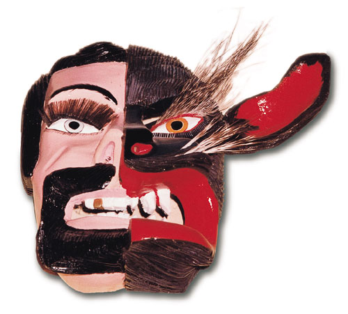 | מסכה טקסית-פולחנית שיצר האמן חואן אורטה, המשלבת מוטיבים מהדת הקדמונית ומהנצרות. הפה הפעור לרווחה מסמל את השער לעולם שמעבר, וישו הוא שומר הסף | צילום: נחום מגד |