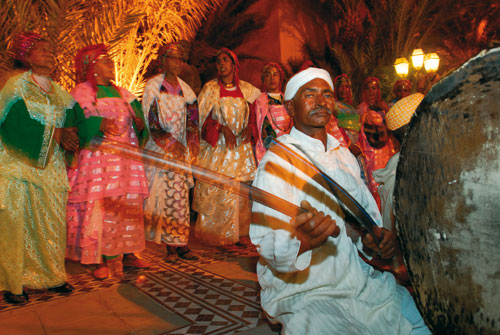 אחרי טז'ין כבש בשוק של טידילי, נסענו לכפר אירילה (Ighirila). לפני הטקס הפרידו את חוה ואותי מהגברים. היה מרתק לראות את הנשים מתכוננות בהתרגשות לטקס, מתייפייפות, מתאפרות ועוזרות להכניס זו את זו לאווירה. במהלך הטקס לא מוגש כל מאכל, ולכן נהוג לאכול לפני הטקס כדי לאגור כוח. אכלנו תבשיל של בשר כבש וירקות שבעבע בכלי חרס. את חתיכות הבשר החמות מניחים על לחם טרי ואוכלים בתיאבון רב.