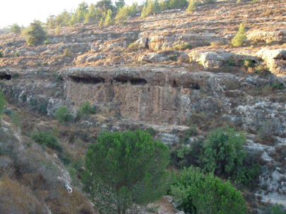 בתום הסיור כאן נשוב אל הנחל באחד השבילים היורדים אליו ונמשיך במורדו. השביל המסומן ירוק מקביל לערוץ עצמו. הוא גולש במורד כשהוא חוצה טראסות אנכיות לקו הערוץ. בחלק מהטראסות עדיין צומחים עצי פרי שהיו בעבר קניינם של יושבי הכפר הערבי קאלוניה שננטש במהלך מלחמת העצמאות: זיתים, אגסים סוריים וגפנים. אם יתמזל מזלנו נבחין בכוס, דורס לילה קטן, ניצב על אחת האבנים או מתעופף, מוטרד, ממסתור אחד לאחר. במורד הנחל יתגלו לעינינו המערות. הגישה אל המערות בגדה הימנית (זו שבה חולף השביל) נוחה ביותר. מומלץ לזחול בהן ולהכירן, והרי לשם כך הבאנו פנסים.
