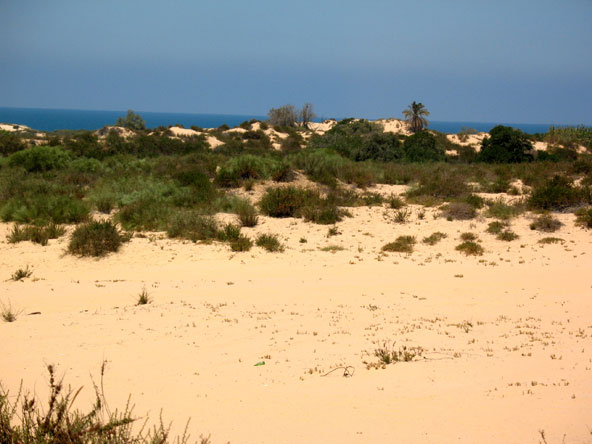 כתם אחד זעיר יש בו בחוף, חולות ניצנים, שאמנם שיירות גמלים עמוסי זיפזיף כבר אינן פוסעות בו, אבל עוד יש בו שקמים שמטילות צל ענקי, ושקעים קטנים בחול יש בו, דקלים מזדקרים מהם כי גומות מים לוחכות את שורשיהם, וכרמים שהיו של אנשים אשר לא ישובו עוד לבוצרם נשרכים על החולות, ורק יודעי ח"ן יודעים היכן הם כדי לבוא אצלם ולבצור את פריים בטרם יתסיסוהו ליין; ושיחים גדולים מנקדים אותו וגם חבצלות של חוף ונר הלילה וקריתמון ימי ולוטוס; וגם מכרסמים ורמשים, נחשים ועופות, טורפים והנמלטים מהם, כולם חיים כאן ביתמות הגדולה הזאת, ואין הם יודעים כי יתומים הם, שעל כן בינתם בינת חיות ולא בינת אדם. כשמביטים אל כל הזהב הזה, הנדמה כמו ים גלי, שאין בו כחול וכרבולותיו ירוקות באין קצף, יש שהוא נראה כעריסה ענקית שחובקת את כל שבה, מערסלת אותו בעדינות ומלטפת באינספור גרגרים בהירים, הגולשים מכרבולות הים הזה אל השקעים. ברוח הצהרים גוברת הטלטלה העדינה, והחול מטפס אט אט במדרון, מסתלסל מעט מעל לשיא הגל הזהוב ונצמד אליו באין רואים. ים החולות הבהיר הזה נמצא מדרום למצודת החוף הערבית הגדולה – קלעת אל־מינה – במבואותיה של אשדוד. הבוקר הצח הוא הספר הפתוח בחולות האלה, שבלחות של הלילה החולף והשחר הבוקע ממנו הוטבעו בהם מדרכי רגליהן של החיפושיות – אלה דהרו על פני החול והותירו אחריהן שובל דרכים כזחלים של טנקים – ומשולשי עקבות של ציפורים שניתרו כה וכה בין השקעים הקטנים והארוכים של הגרבילים והירבועים. פה ושם כבר נרמסו העקבות, ואין יודע אם שועל הוא שרדף אחרי הכרוון או אם דורבן נבר בעצבנות בין שורשי ידיד החולות; האם נחש הוא זה שעקב אחרי העפרוני או שמא שחרורית שחמקה ממקורו של ציידהּ.