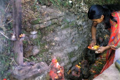 המבקר לראשונה בעמק קטמנדו, שבנפאל, יראה מחזה מוזר: בוקר בוקר, בשעה מוקדמת מאוד, יוצאות אל הרחובות המוני נשים קטנות וצנומות, עופות שמיכות והשינה עדיין נסוכה על פניהן. הן נעות חרש בין המקדשים, המזבחים והפסלים, מגש מתכת בידיהן, ומחלקות לכל פסל את המגיע לו: כמה גרגירי אורז, פרחים, אבקה אדומה, וקצת חלב או מים. בשעת מעשה אין פיהן פוסק מלמלמל את המנטרה – מילת הקסם או השבח לאל – מקודשת המסורת והסתומה לפעמים למבטאיה. הילדים בדרכם לבית הספר, והגברים בדרכם לשוק או לעבודה, כולם חלק מתהלוכת הממלמלים, טובלים אצבע באבקה האדומה שזה עתה הוגשה לאל, מושחים מעט ממנה על מצחם ומפזרים קצת מעלי הכותרת שהונחו לרגלי האל על שערות ראשם.
